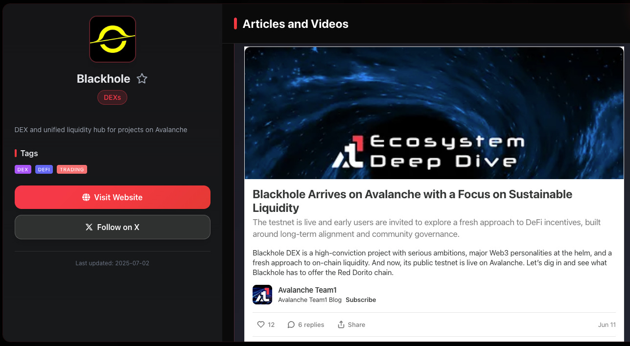 The map also goes beyond simple listings. Many projects are paired with content created by Team1 members, including blogs, walkthroughs, and videos that explain how things work in practice. Instead of just reading about a project, people can watch a Team1 member break it down or follow along with a written guide. This makes the ecosystem map a directory and a library of lived experiences inside Avalanche.