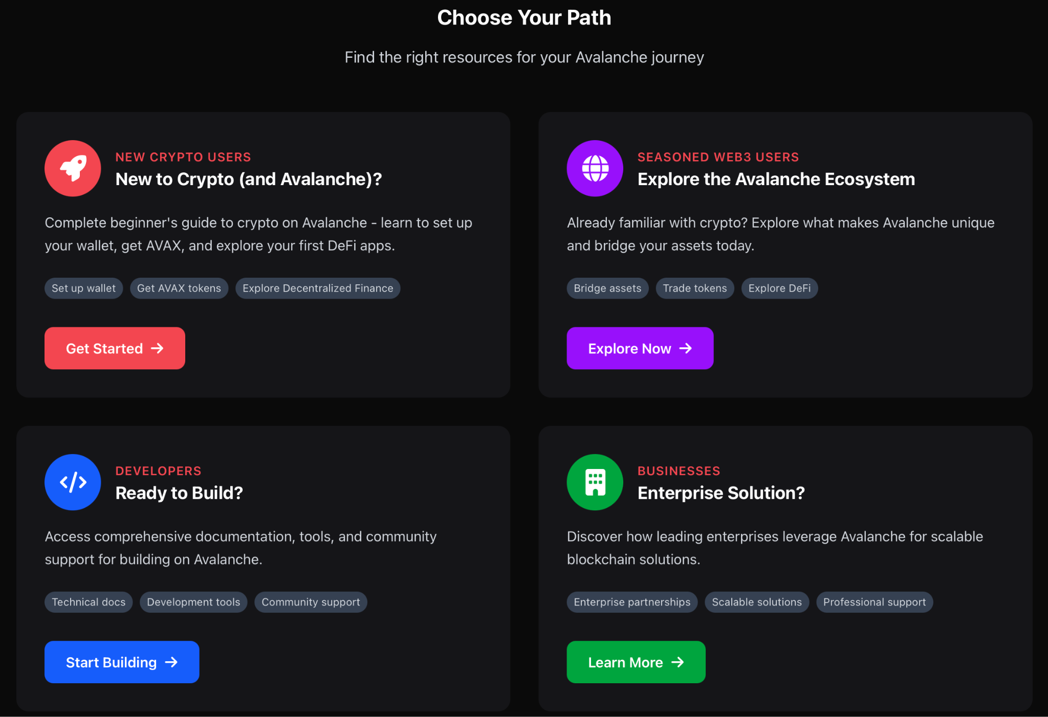 Web3 Natives: A direct route for experienced users to bridge assets, explore DEXs, and dive straight into Avalanche-native DeFi.