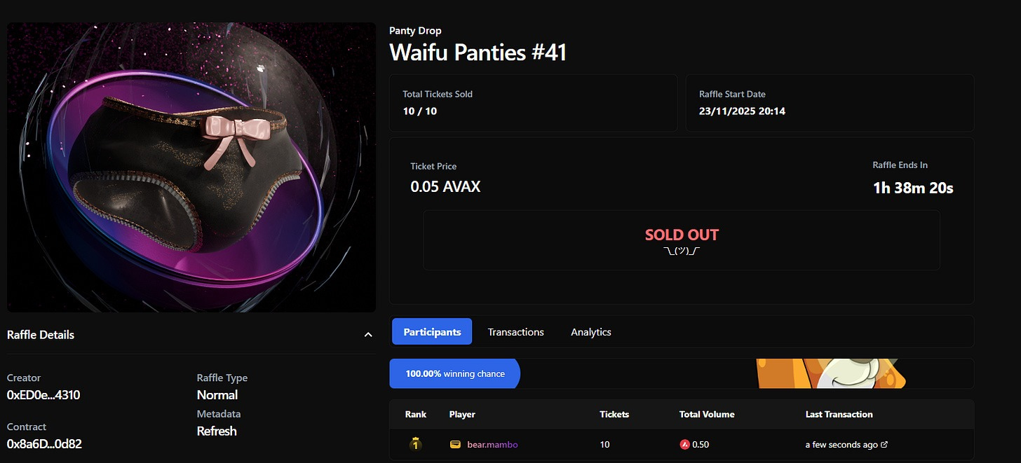 Vero listed this piece above on Raffllrr, an Avalanche marketplace that distributes artwork via a raffle system. This is one of my favourite onchain products onchain developed by Deep Water Studios. It’s an exciting way to interact with artists, and allows for a low cost chance of entry to collect rare works that may otherwise be too expensive to purchase. While writing this article a user listed an infamous piece from the C-chan collection. The price of tickets were so low I decided to sweep the raffle.