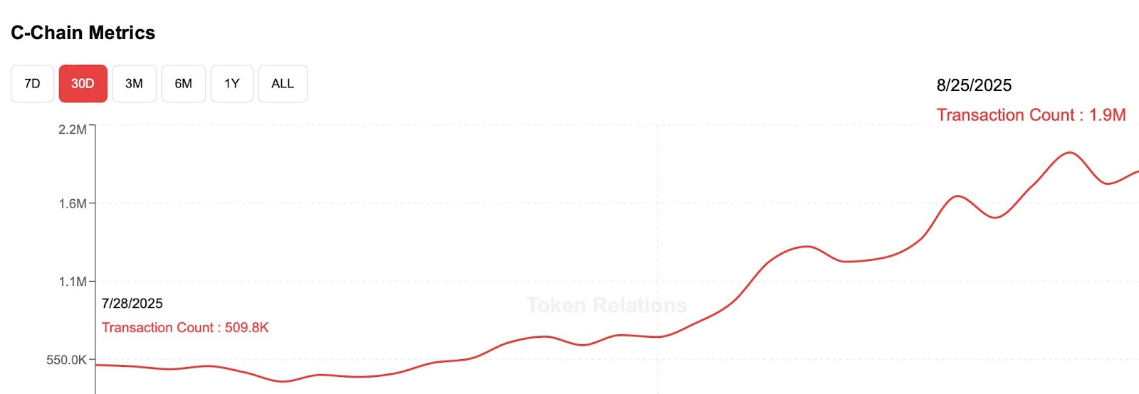 Daily transactions for Avalanche C-Chain rose 272% over the month, driven largely by application-specific L1 blockchains.