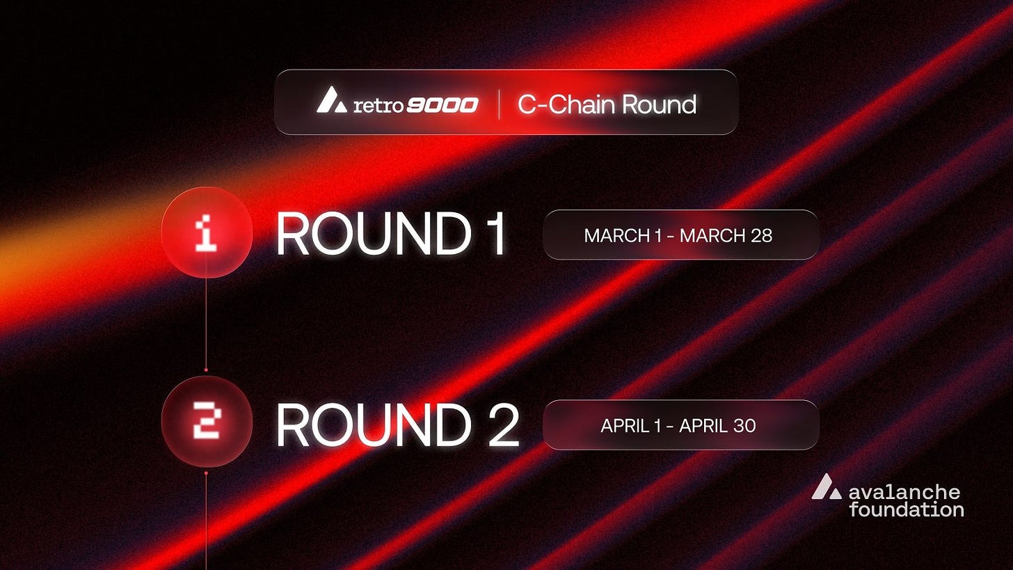 The Retro9000 C-Chain Round first distribution launches March 2nd, rewarding projects driving real onchain activity measured by AVAX burned. [Grantees announcement]() | [C-Chain Round details]