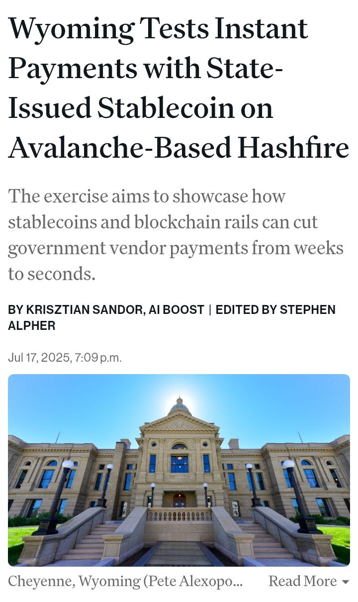Wyoming tested its stablecoin WYST for public sector payments.