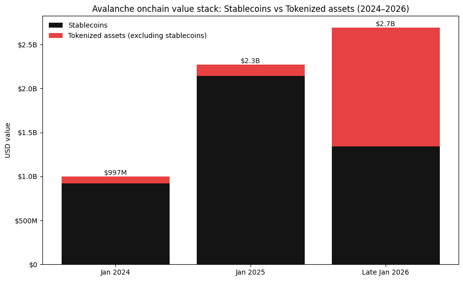 In January 2024, Avalanche had around $74.4M in tokenized assets excluding stablecoins. If we include stablecoins as the settlement layer, the total stack was about $985M (with ~$922.9M in stablecoins). That’s not “nothing,” but it’s still the stage where RWAs are proving they can exist onchain with workable issuance and custody flows, while stablecoins carry most of the day-to-day value movement.