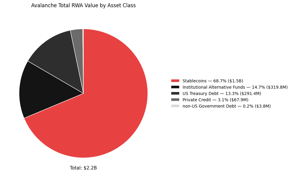 Avalanche’s total RWA value is best understood as a stack with two layers: stablecoins as the liquidity base, and tokenized yield and credit as the growth layer. In the snapshot here, the full pie totals roughly $2.18B, led by stablecoins at ~$1.5B (about 68.7%), which signals Avalanche’s role as a high-utility dollar rail for settlement and everyday onchain movement. The remaining ~31.3% is the “RWA core,” dominated by institutional-grade products: Institutional Alternative Funds at ~$319.8M (about 14.7% of total) and US Treasury Debt at ~$291.4M (about 13.4%), with Private Credit at ~$67.9M (about 3.1%) and non-US government debt at ~$3.8M (about 0.2%) rounding it out. Put simply: most of Avalanche’s real-world value today is still liquid dollars, but a growing share is shifting into regulated, yield-bearing exposure that looks increasingly like traditional finance products running onchain.