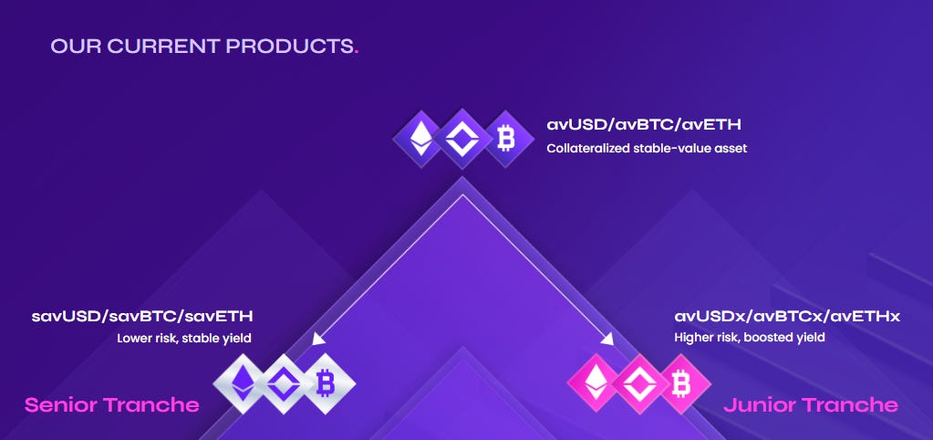 avAssetX - boosted, junior tranche tokens that take on more risk in exchange for higher upside. You “boost” your avAsset to get a higher-risk, higher-reward position. These tokens receive extra strategy yield, but they also absorb losses before senior holders if something breaks.