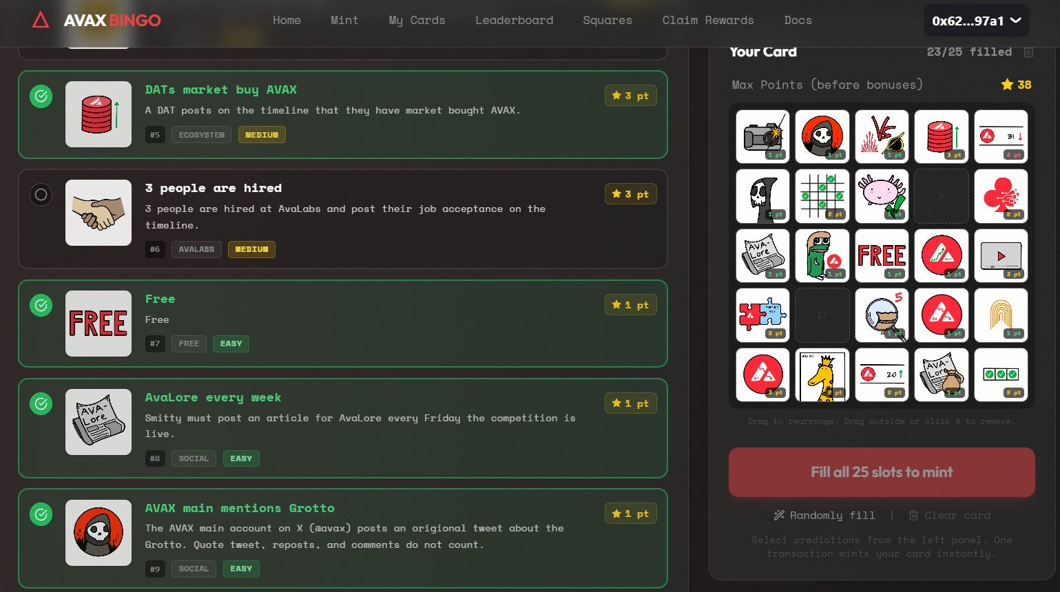 The AVAX Bingo mint is officially over, and the game is now live. From this point onward, any predictions that are completed through June 24 will count toward the final scores.