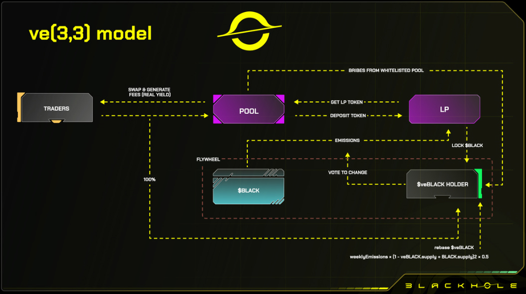 This model encourages users to lock tokens for voting power and rewards. It’s based on a game theory principle known as (3,3), which means that when all users cooperate by locking tokens and voting, the collective rewards are greater than if they acted alone. Everyone wins more by playing together. Blackhole improves this model with two kinds of voting and escrow (veNFTs):
