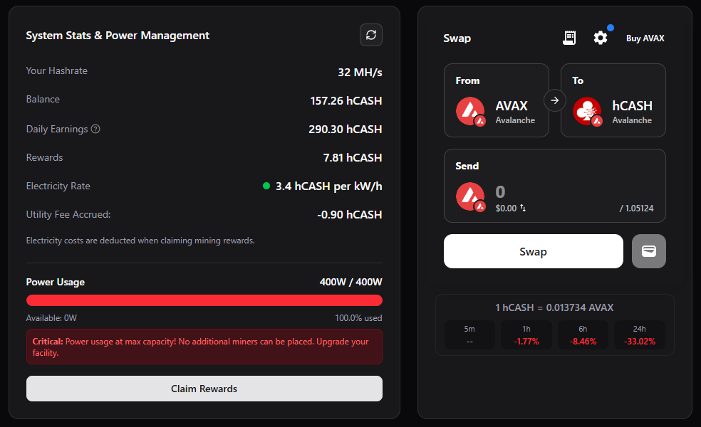 The power ceiling, hashrates, and pricing in $AVAX and hCASH forces you to do more math than Russell Crowe in A Beautiful Mind: do you run fewer high-hashrate miners or fill your grid with lower-consumption units? Electricity rates also shift dynamically, calculated for each facility tier, with a trend indicator ranging from “Normal” to “Surge Rate.” When rates spike, the fees for claiming your rewards increase. In addition to determining the optimal mining setup, you need to consider the optimal time to claim rewards (or compound into better setups).