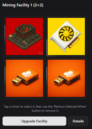 The strategic layer is interesting because it forces miners into trade-offs. Each miner NFT includes two key metrics: hashrate and power usage. And each facility has a fixed power capacity, so you can’t just add the most powerful miners without accounting for those constraints. You need to find the most efficient and affordable miner available, while also keeping in mind that some miners might be sold out or unavailable on the secondary marketplace. There is also a cooldown period after upgrading facilities, so you can’t upgrade a facility whenever you want to.