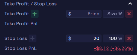 In the example below, the stop loss is set to a price of $20 ($AVAX was worth $22.68 at the time of writing), and 100% of the position would be sold at $20. You can see how much of your position will be lost in dollars and a percentage basis. You can adjust this to fit your specific risk tolerance.