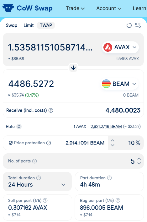Popular platforms like 1inch and CoW Swap are solid choices for checking out these advanced features. However, Cow Swap has a minimum wallet balance amount of $5,000 to initiate TWAP orders (probably not a big deal for ballers like us).