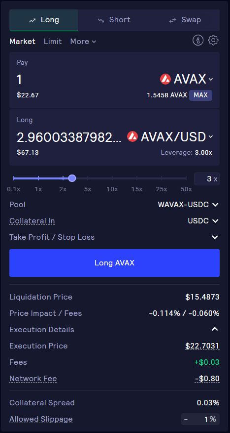 Leverage allows you to borrow funds to increase your position size. For example, if you only have 1 $AVAX and you use 3x leverage, that means you can enter a position worth 3 $AVAX. In this case, your 1 $AVAX acts as the margin/collateral that backs the trade. This amplifies both potential gains and potential losses.