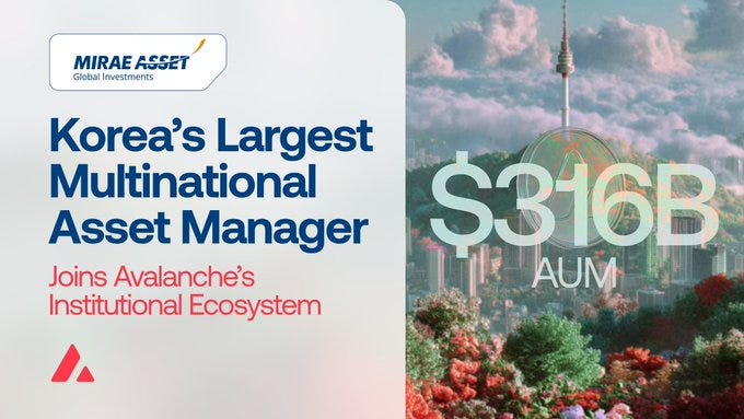 Mirae Asset Global Investments, managing approximately $316 billion across 16 global regions, signed an MOU with Ava Labs to explore asset tokenization on Avalanche.
