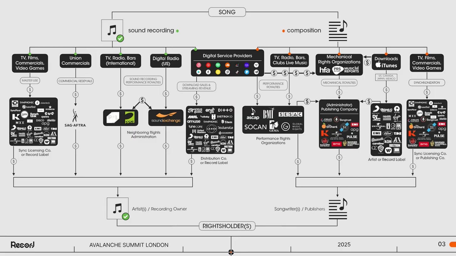 This slide from Record’s Avalanche Summit talk clearly illustrates the fragmented nature of the royalty journey for a single track, with streaming, sync licensing, and public performance all adding layers. For artists and their teams, managing all these pieces often makes finances unclear and difficult to track.