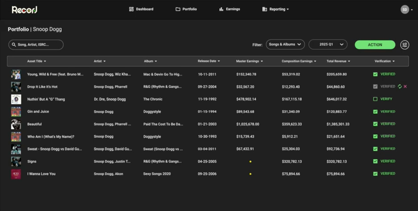 A portfolio dashboard displays streaming earnings, composition shares, and verification tools, all in one place. The platform is built for utility, not speculation, and it is already working for artists with established catalogs.