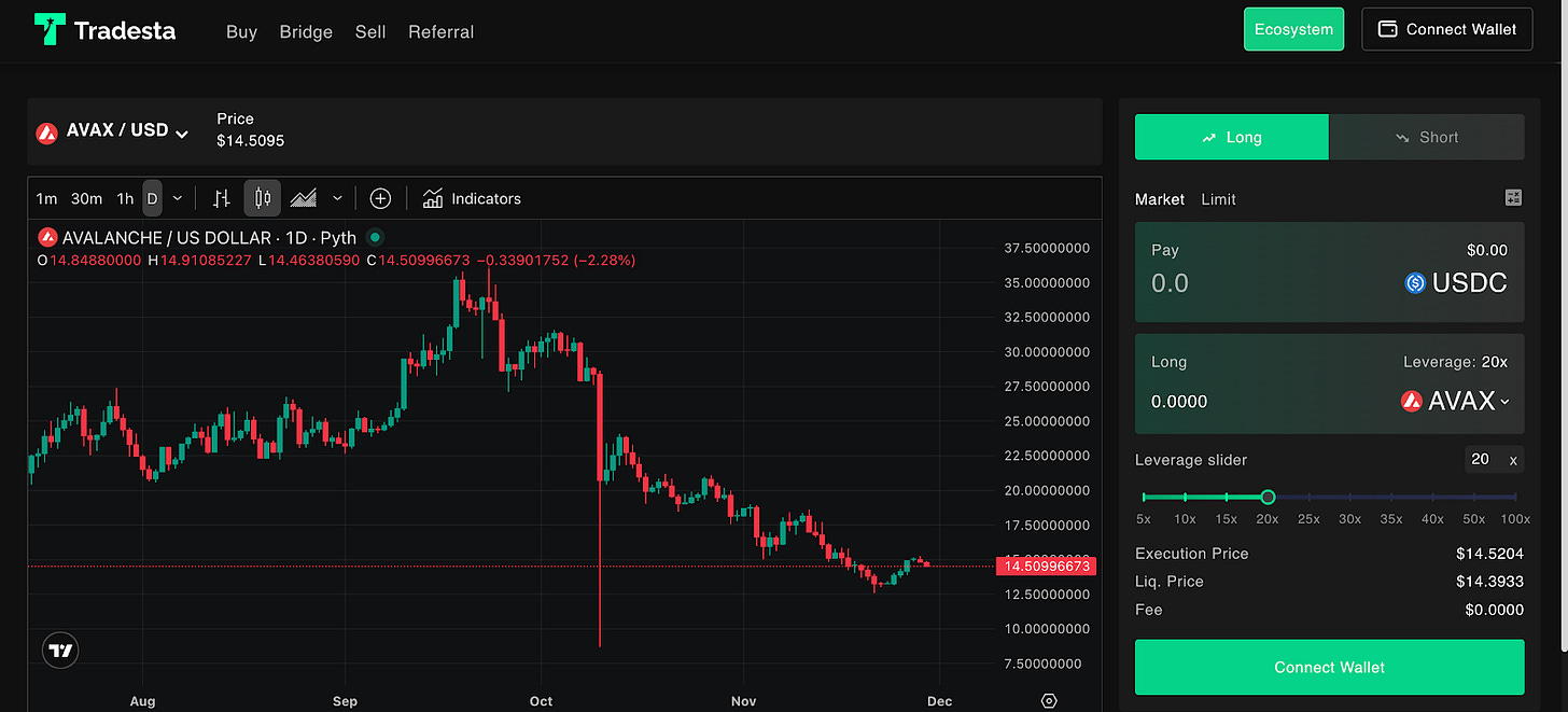 TradeSta is a fully decentralized perpetuals exchange on Avalanche. Every trade, funding update, and liquidation is governed by smart contracts. Users connect a wallet, put up USDC as collateral, and open long or short positions across supported markets with leverage up to 100×. There are no custodians or account sign-ups, just on-chain execution.